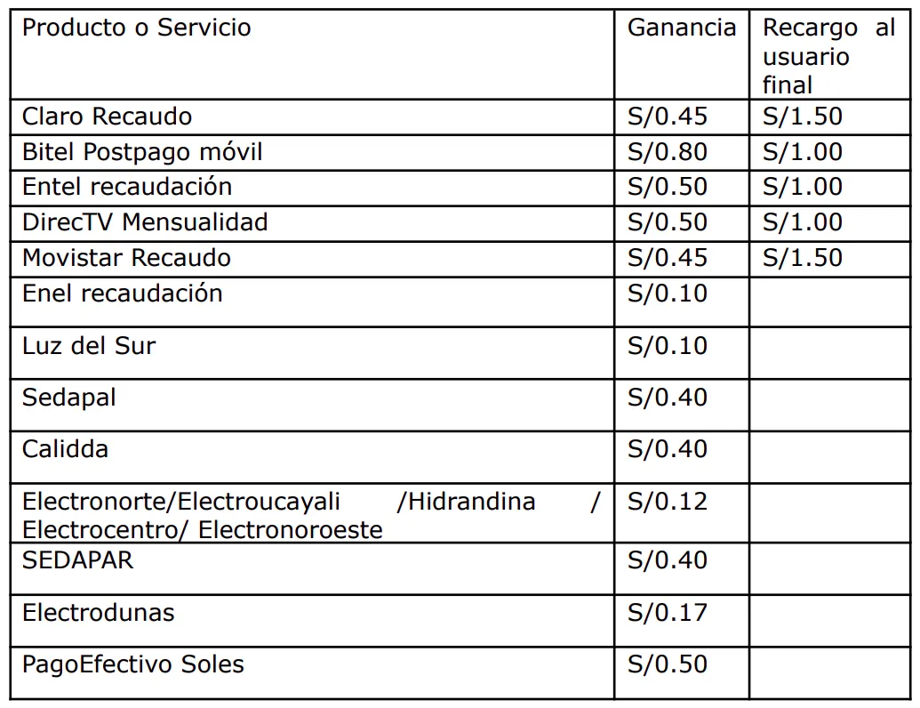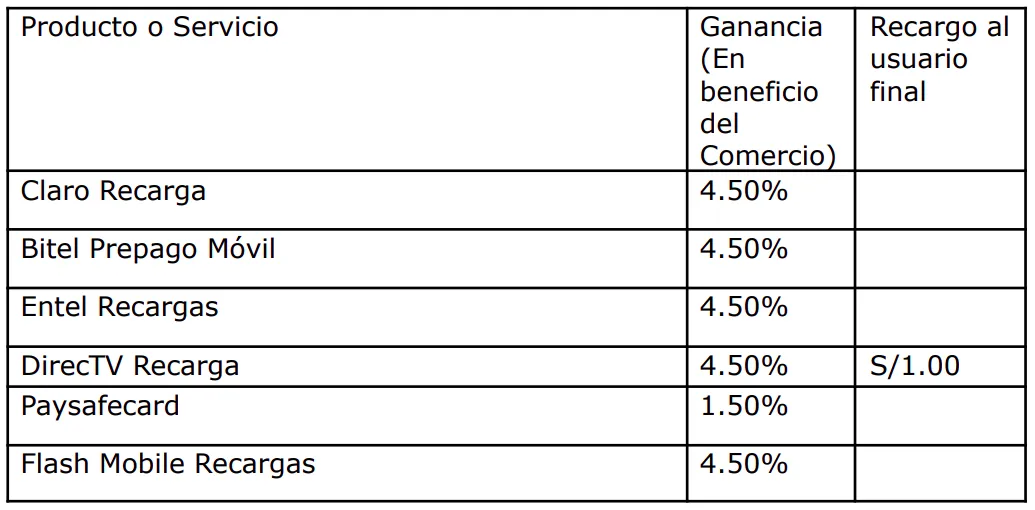 | Producto o Servicio | Ganancia (En beneficio del Comercio) | Recargo al usuario final |